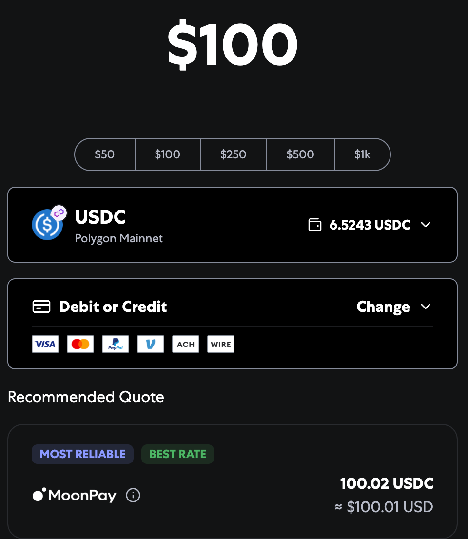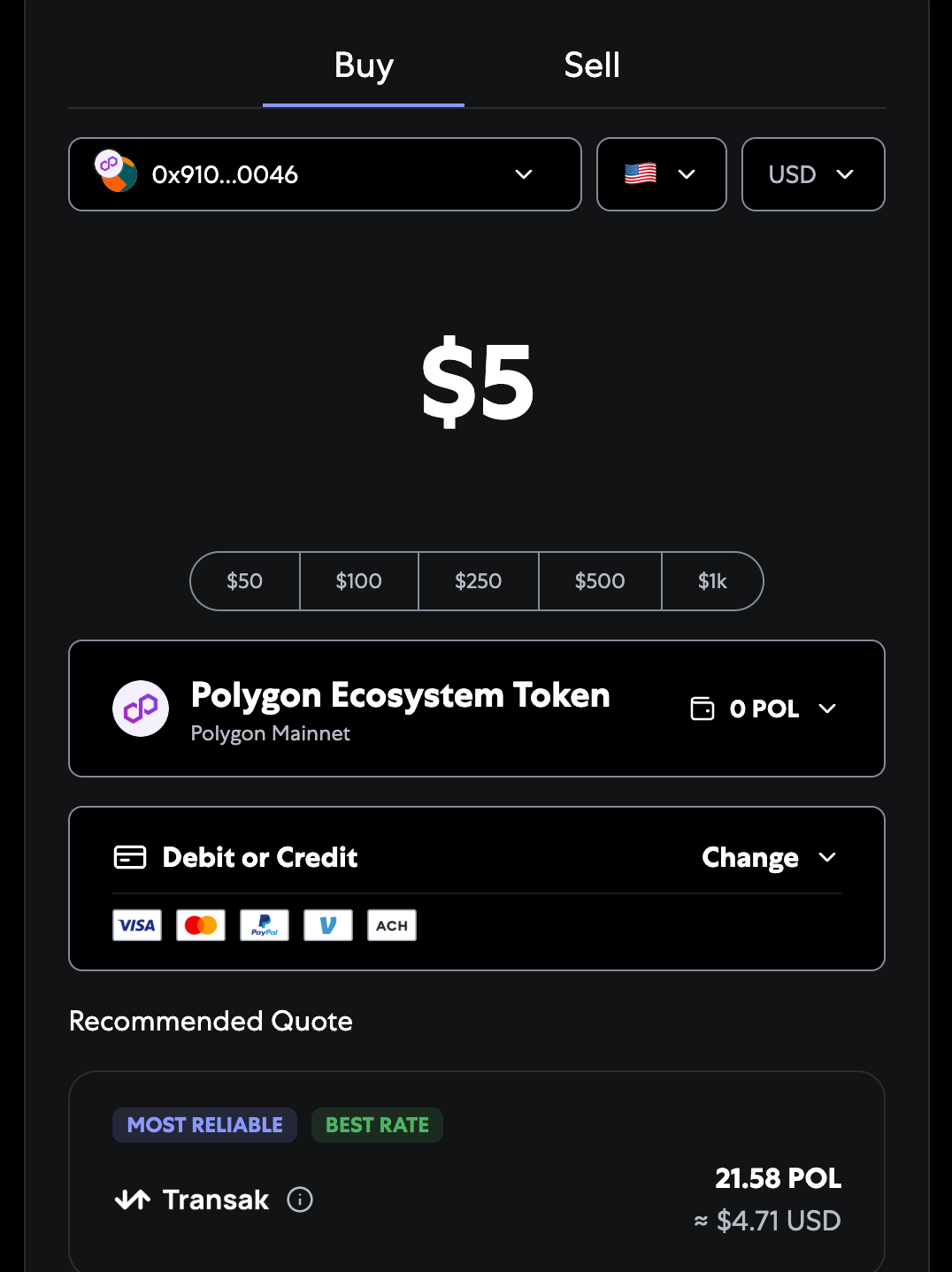 - Select USDC on Polygon, input the amount (e.g., $50 for sneakers), and purchase using a payment method (e.g., card, Apple Pay).
