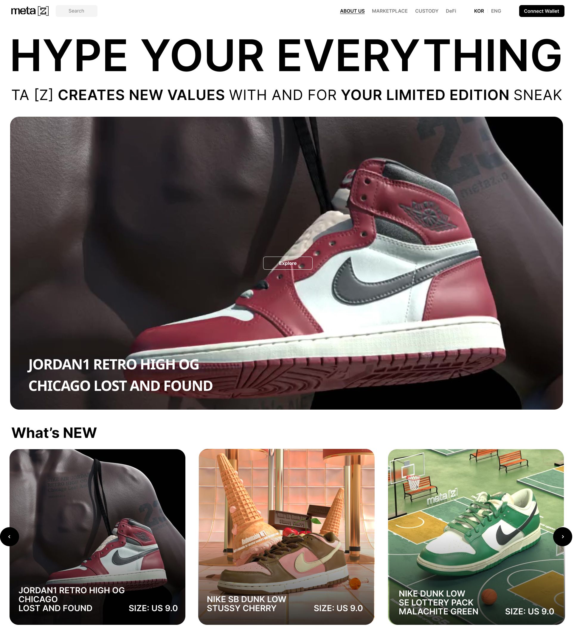 Meta[Z] is the very first Web 3.0 NFT platform, which provides a Custody service that safely stores products, mainly collectible sneakers, and issues NFTs for the sneakers. The platform significantly lowered the time and spatial constraints when collecting collectibles, allowing collectors to easily trade collectibles with NFTs.