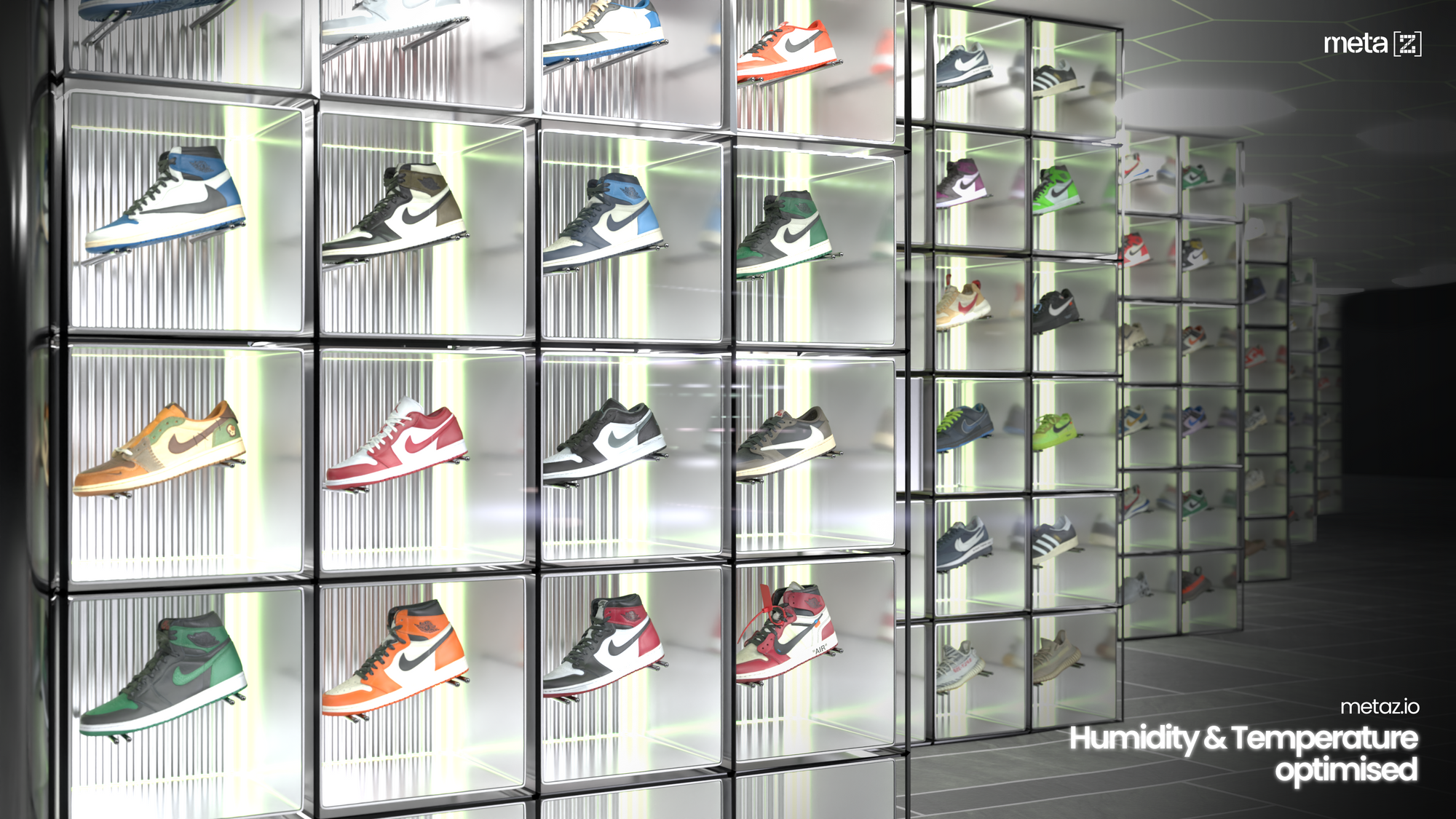 Storing sneakers is crucial when it comes to collectibles especially sneakers. Representing the limited edition sneakers NFT marketplace, metaZ has a dedicated warehouse equipped with an optimally controlled environment best suits keeping sneakers at the best condition. The vault is managed and controlled with a larger and more sophisticated system. The vault is set to perfectly block the cold or hot temperature, humidity, and UV rays that may be the harming factors to sneakers. Each pair of sneakers is stored in an independent safe box.