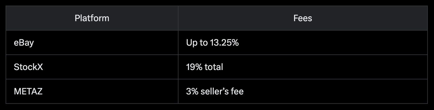 From a cost perspective, Sneaker Custody is structured to maximize user returns. Our platform charges a 3% seller’s fee per transaction, a rate notably lower than those of major resale platforms. For comparison, eBay applies fees of up to 13.25%, while StockX’s total fees can reach 19%, including transaction and processing costs. Here’s a breakdown from our fee comparison post: